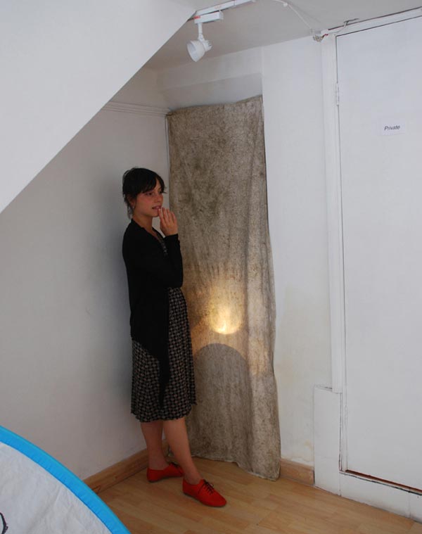 Welcome Mr. K (2007), documentation of installation, water, earth, canvas, CD player, metal bowl.